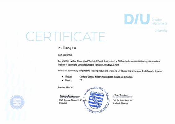 2023年,参加公司国外交流项目:德国德累斯顿大学课程“机械臂的控制与仿真”顺利结业并获得结业证书