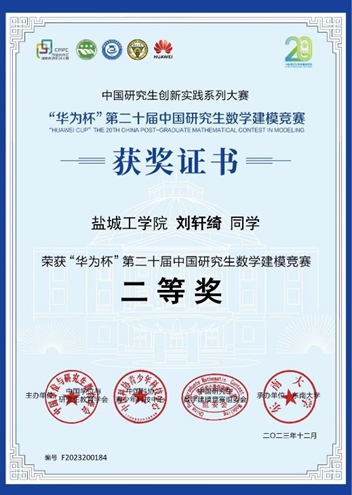2023年,获“华为杯”第二十届中国研究生数学建模竞赛国家二等奖