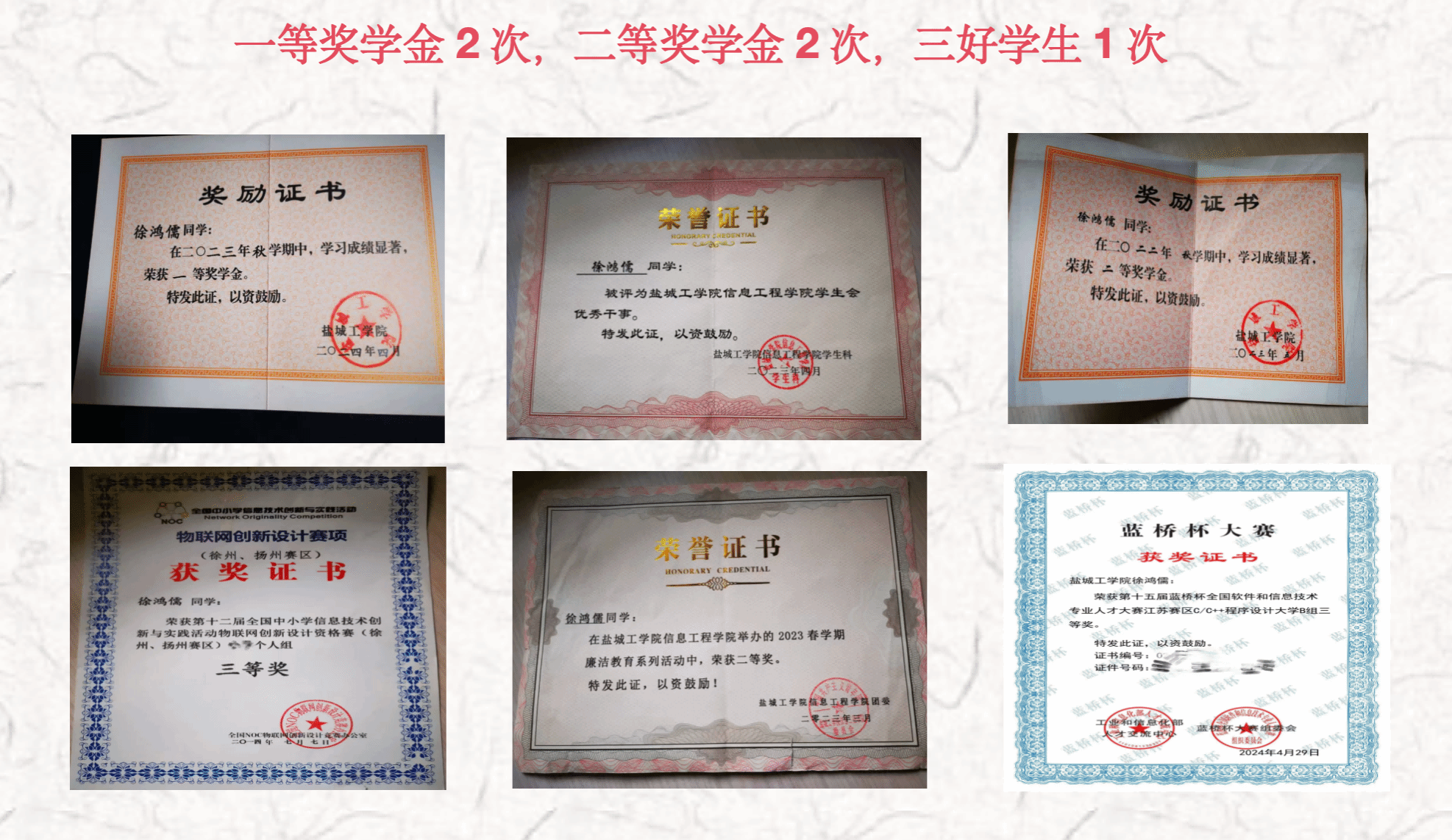 两次获得校一等奖学金、两次校二等奖学金,一次三好员工,员工会优秀干事,第十五届软件类C/C++程序设计大学B组三等奖,物联网创新设计赛项三等奖等奖项。