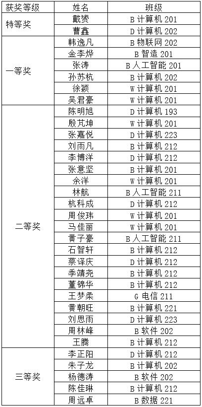 本次竞赛设特奖等奖2名,一等奖6名、二等奖21名、三等奖5名。williamhill官网B计算机201戴赟、D计算机202曹鑫两位同学获特等奖,B物联网202韩逸凡、B人工智能201张涛、B计算机202孙苏杭、W计算机201徐颖、吴君豪等五位同学获专业组一等奖,B智造201金李烨同学获非专业组一等奖。