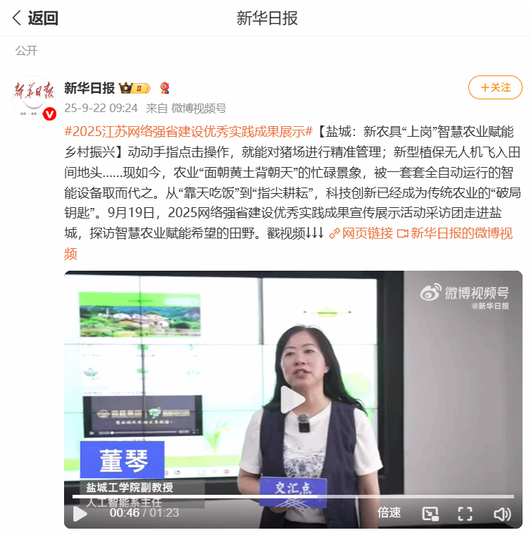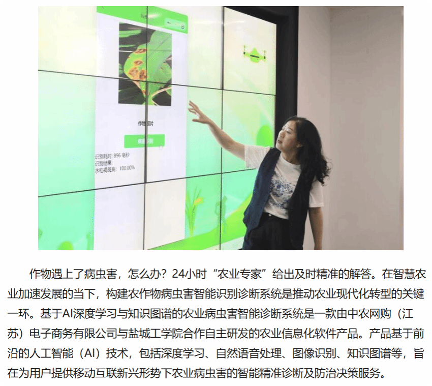 williamhill官网教师董琴团队和中农网购(江苏)电子商务有限公司合作开发的农作物病虫害智能识别诊断系统取得突破性进展,并被评为2025江苏网络强省建设优秀实践成果。2025年9月19日,团队负责人董琴老师接受中央新闻网站:人民网、新华网、央视网、央广网,以及省内的中国江苏网、新华报业网、交汇点新闻、荔枝网、我苏网、扬子晚报网、现代快报网、群众网等重点新闻网站十多家单位记者的采访。该团队目前开发了农作物病虫害智能识别诊断系统、大模型问答系统、农业服务系统及惠农小程序,信息通过API、App和硬件终端集成等方式提供服务。农民和农服人员拿出手机拍摄就可准确知道病虫害的类型,通过深度学习算法、知识图谱、大模型、智能体等技术,形成“识别--指导--农服”的闭环服务,解决用户的盲点和企业农服管理的痛点。