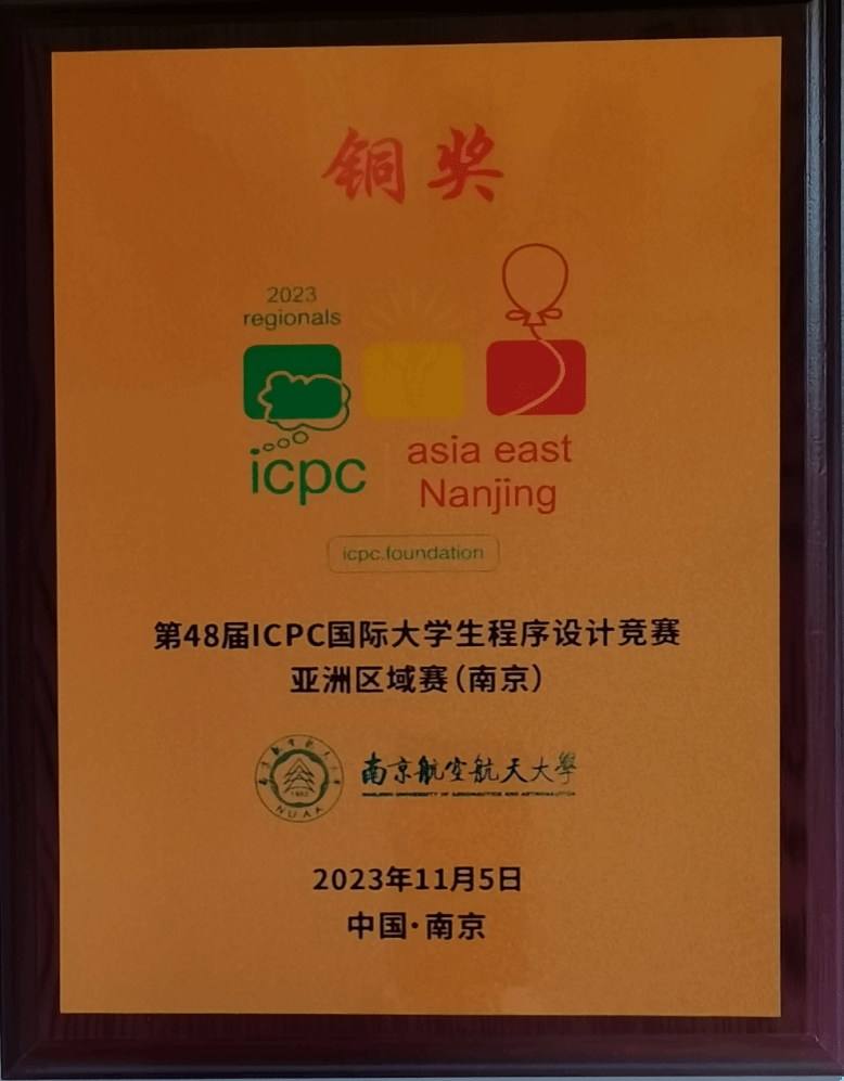 第48届ICPC国际老员工程序设计竞赛亚洲区域赛(南京)铜牌