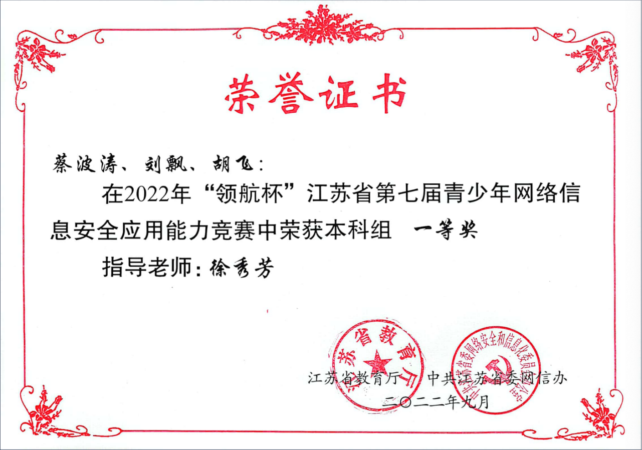 公司员工在江苏省第七届青少年网络信息安全应用能力竞赛(高校组)中荣获一等奖