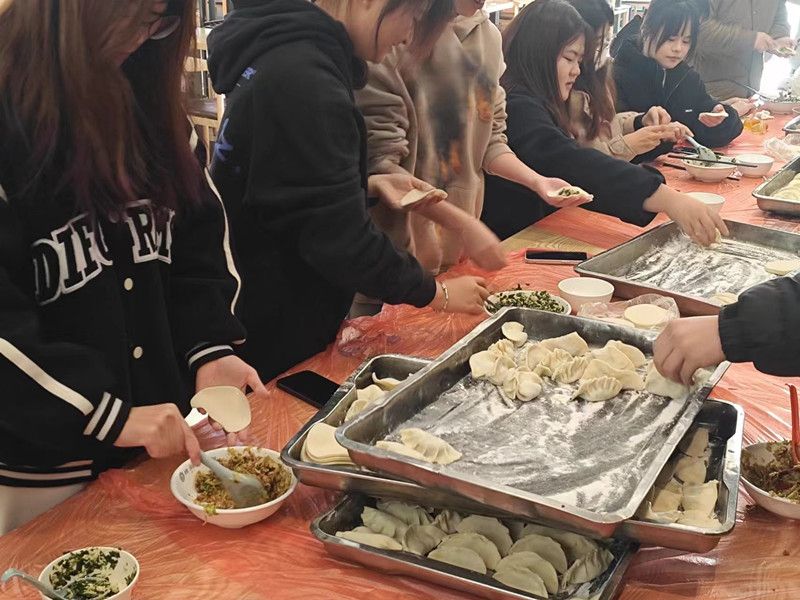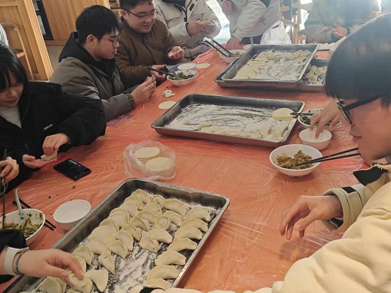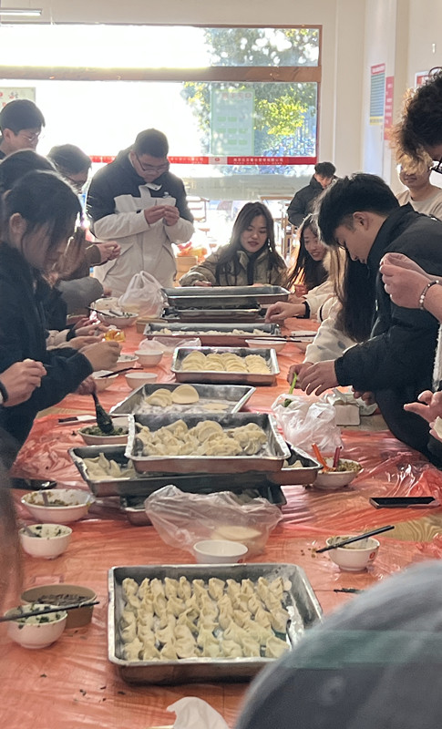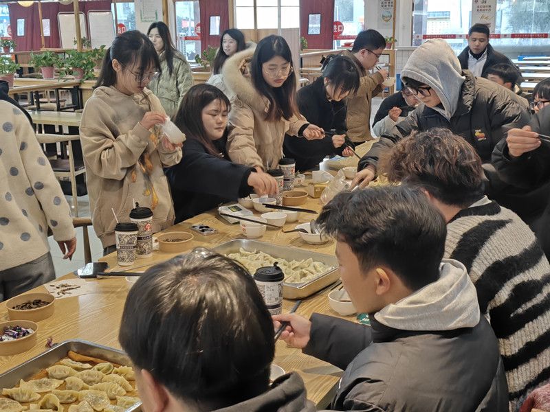 同学们分工协作,整理餐台,准备桌布,制作馅心,杆制面皮,大家迅速融入包饺子的温馨氛围中。准备工作做好后,餐厅师傅手把手教同学们包水饺,大家认真学习,依次开始包水饺,来自外省的同学还包出有自己家乡特色的饺子,交流着家乡的节日习俗。大家欢聚一堂座谈,相互交流一年的来的感受和收获,回忆学习生活中的幸福时光。当热气腾腾的饺子端上桌时,大家围坐在一起,共同品尝自己亲手包制的美味饺子,分享着冬至和饺子的故事,感受冬日的温馨和幸福。